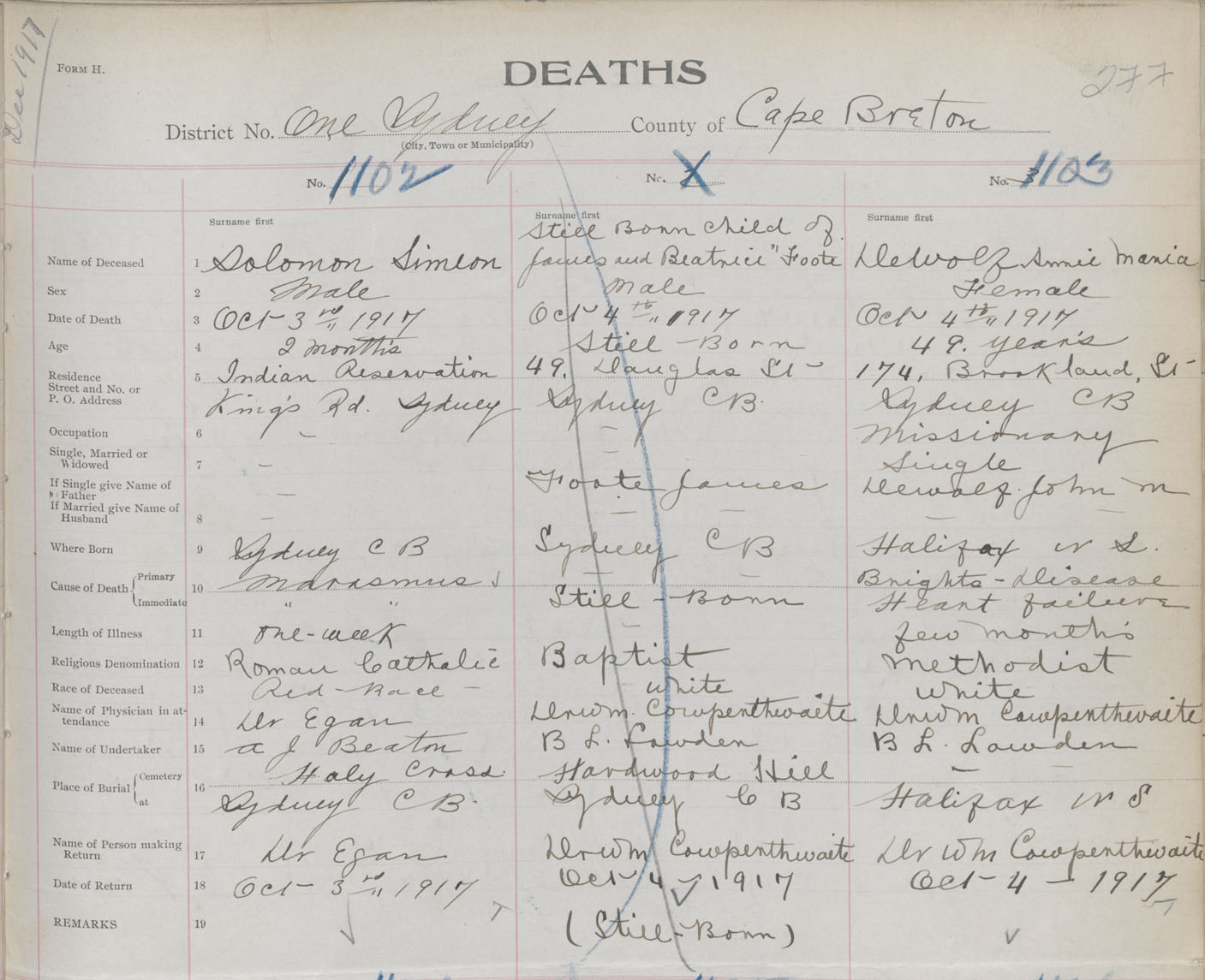 Death Registration: Year: 1917 book: 29 page: 277 number: 1102