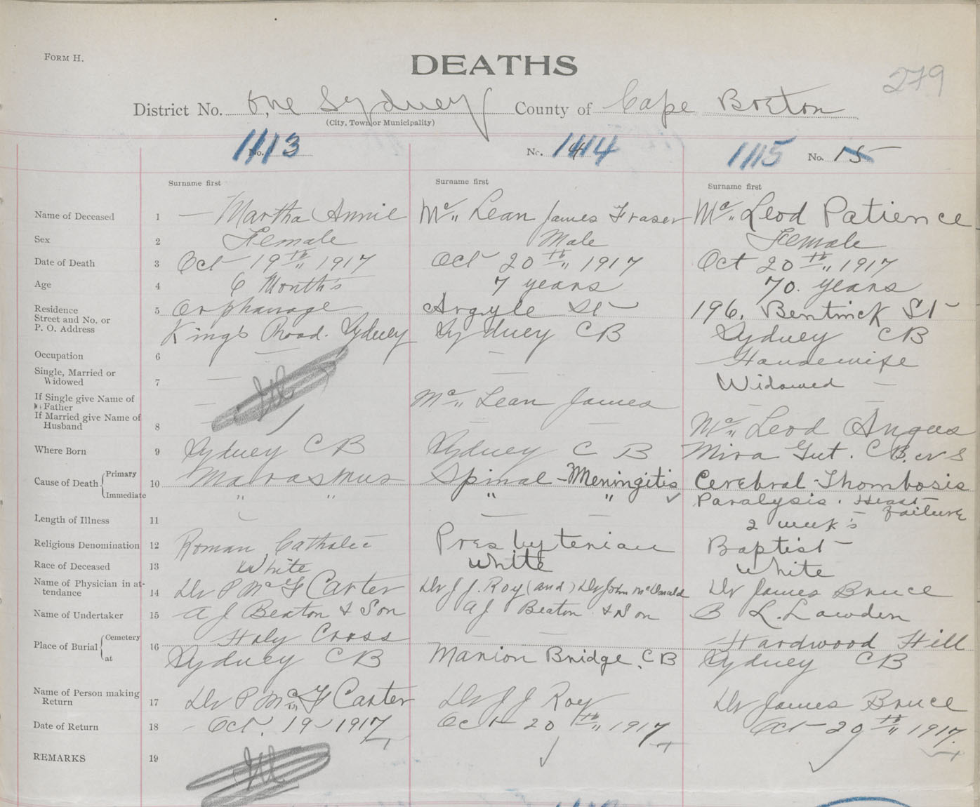 Death Registration: Year: 1917 book: 29 page: 279 number: 1113