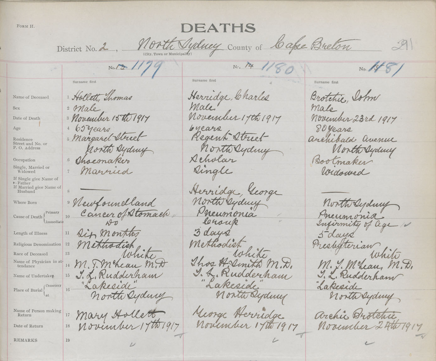 Death Registration: Year: 1917 book: 29 page: 291 number: 1179