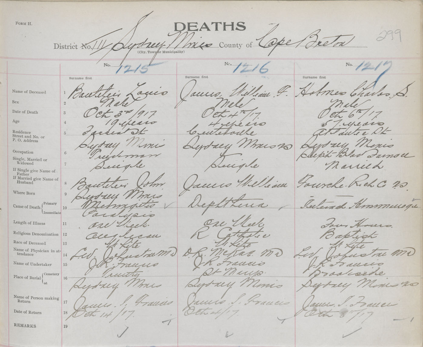 Death Registration: Year: 1917 book: 29 page: 299 number: 1215
