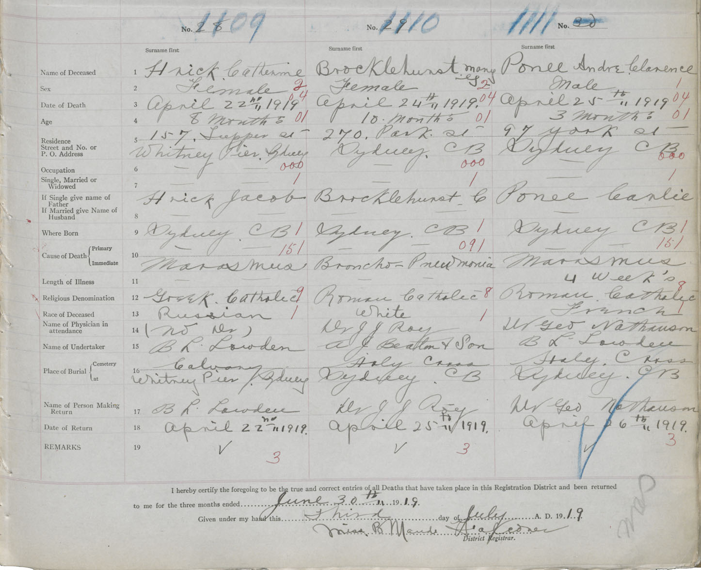 Death Registration: Year: 1919 book: 30 page: 253 number: 1111