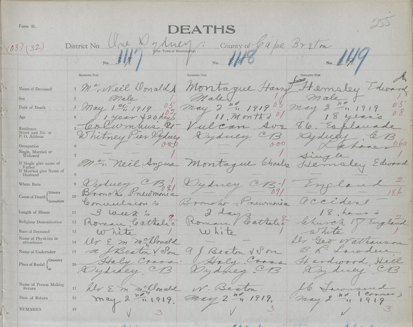 Death Registration: Year: 1919 book: 30 page: 255 number: 1119