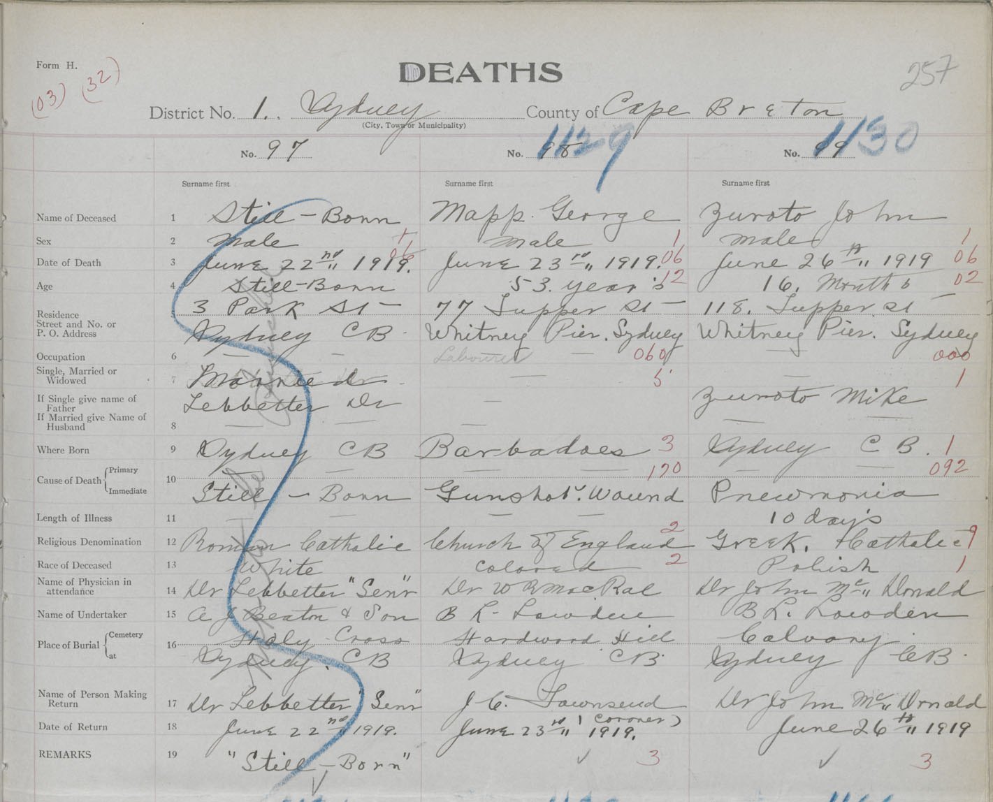 Death Registration: Year: 1919 book: 30 page: 257 number: 1130