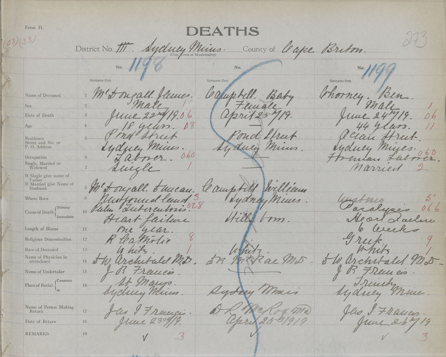 Death Registration: Year: 1919 book: 30 page: 273 number: 1198