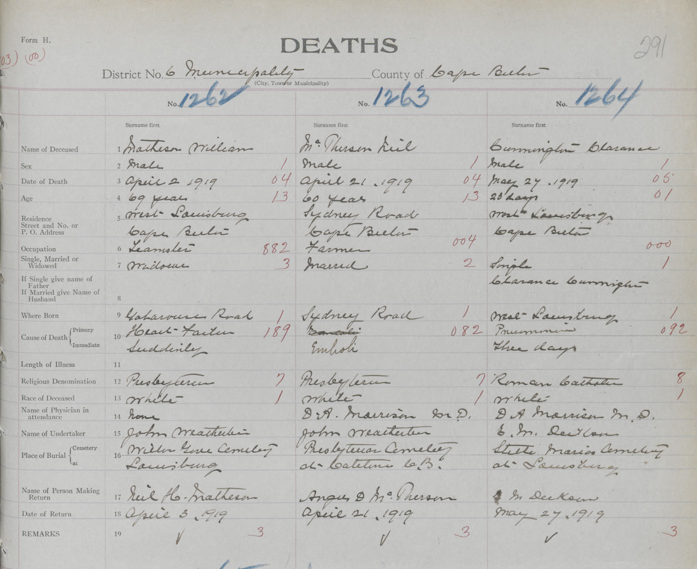 Death Registration: Year: 1919 book: 30 page: 291 number: 1264