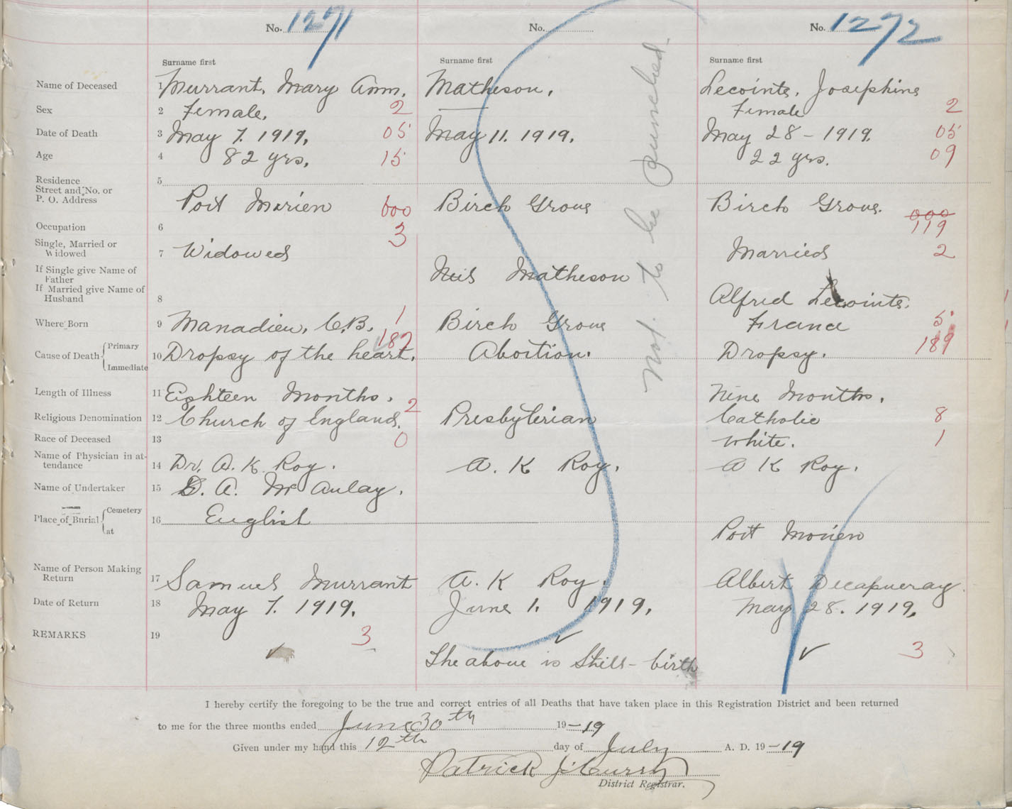 Female Death Registration: Year: 1919 book: 30 page: 295 number: 1272