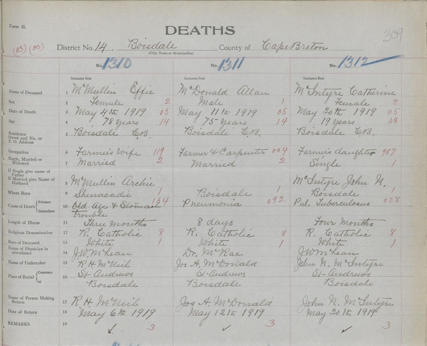 Death Registration: Year: 1919 book: 30 page: 309 number: 1312