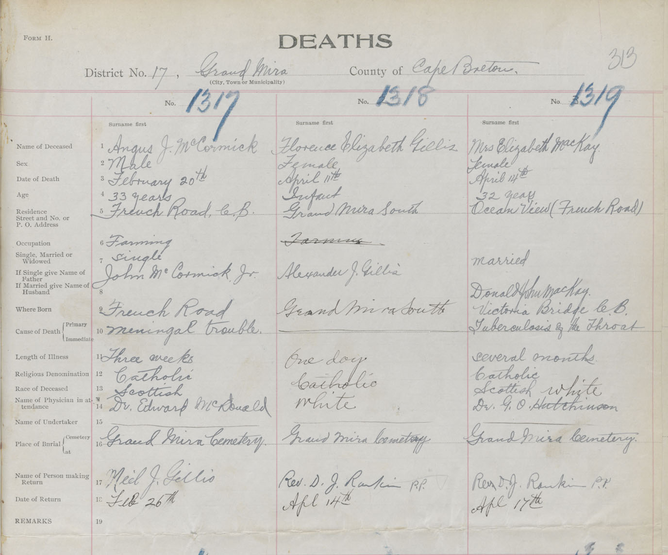 Death Registration: Year: 1919 book: 30 page: 313 number: 1319