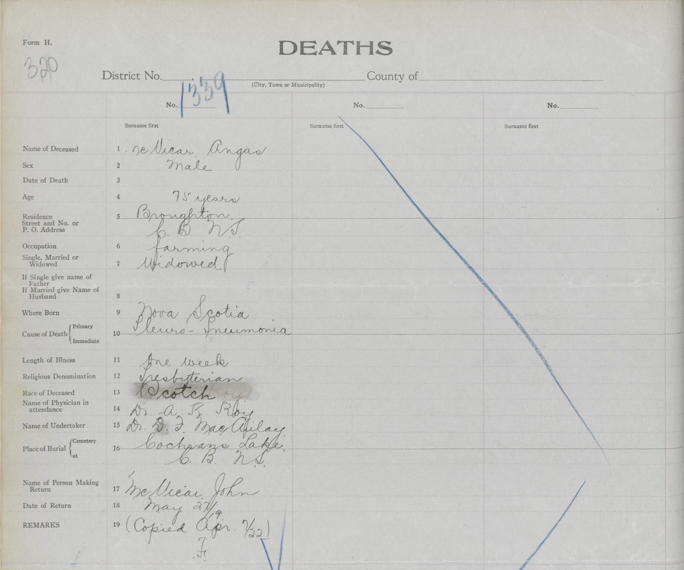 Death Registration: Year: 1919 book: 30 page: 320 number: 1339