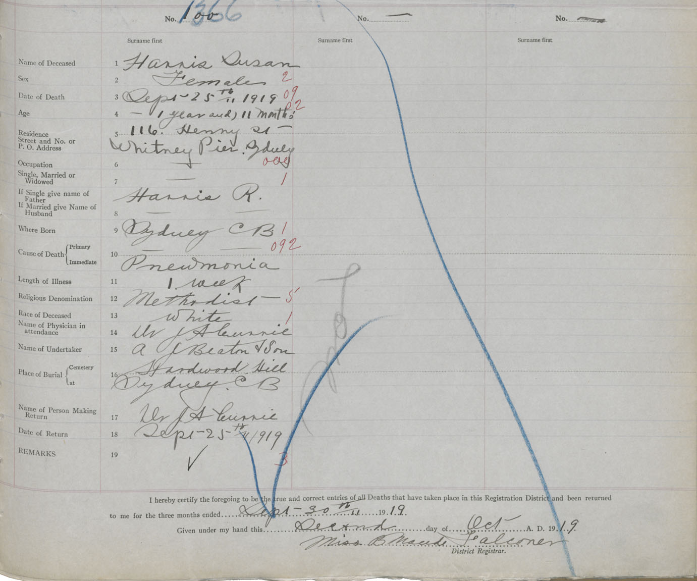 Death Registration: Year: 1919 book: 30 page: 327 number: 1366