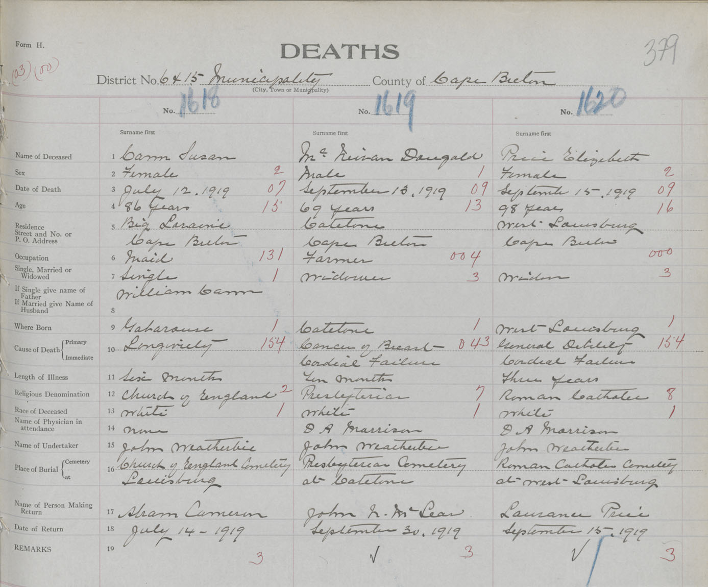 Death Registration: Year: 1919 book: 30 page: 379 number: 1618