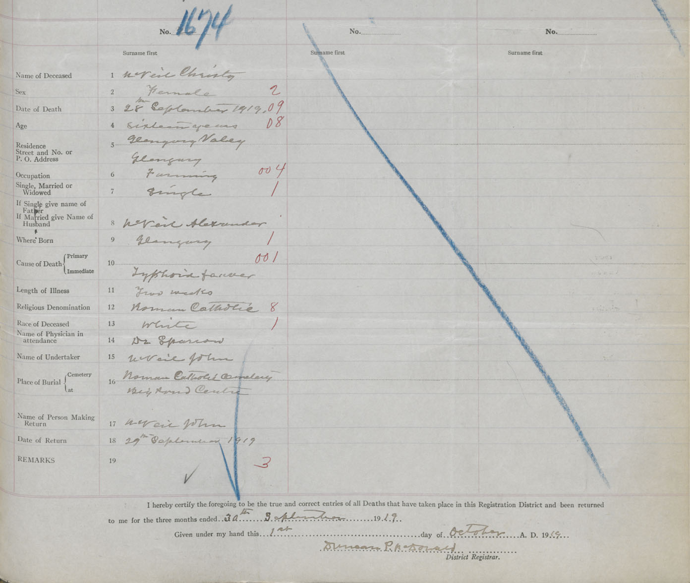 Death Registration: Year: 1919 book: 30 page: 399 number: 1674