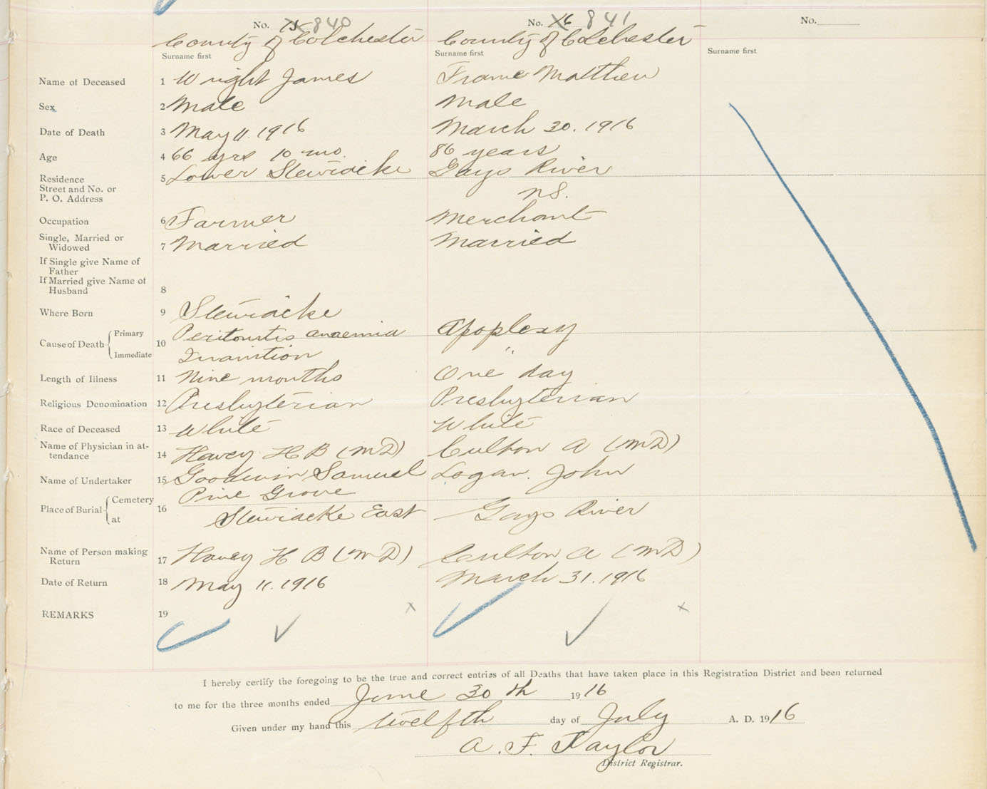 Male Death Registration: Year: 1916 book: 31 page: 253 number: 841