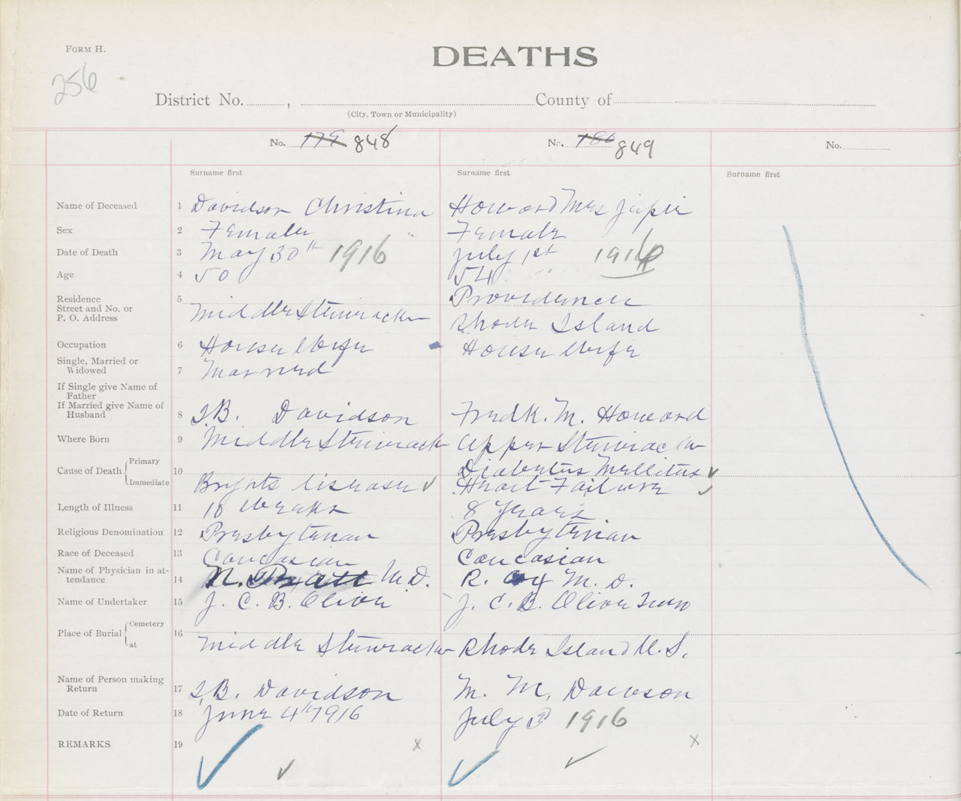 Female Death Registration: Year: 1916 book: 31 page: 256 number: 849