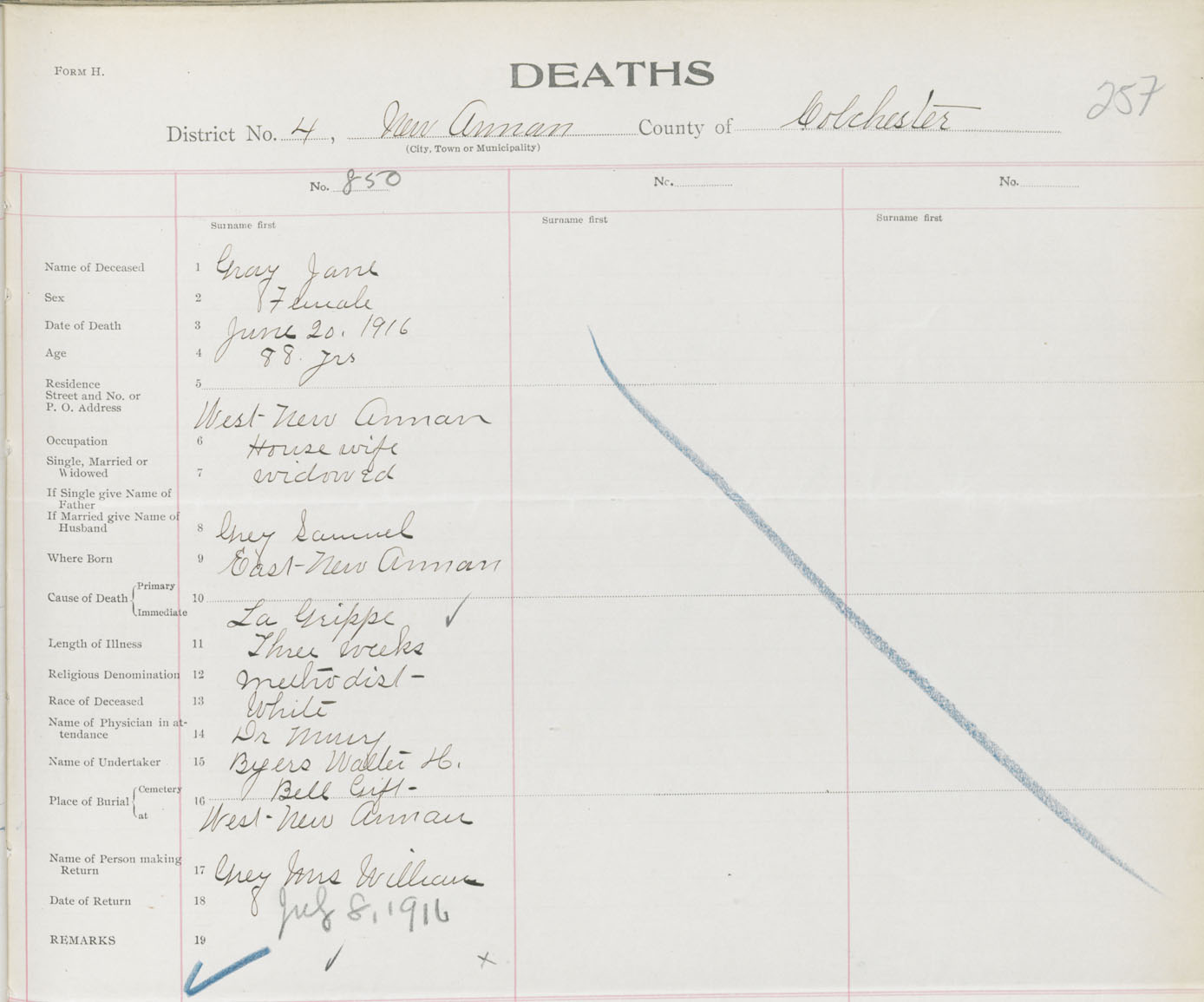 Female Death Registration: Year: 1916 book: 31 page: 257 number: 850