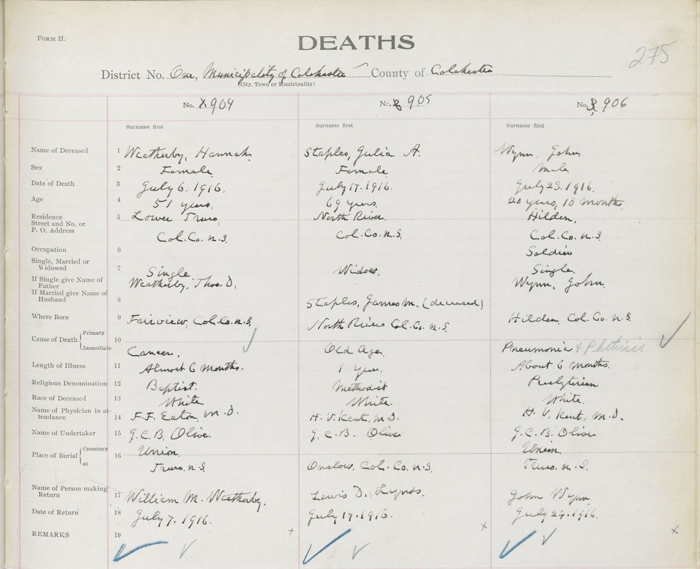 Male Death Registration: Year: 1916 book: 31 page: 275 number: 906