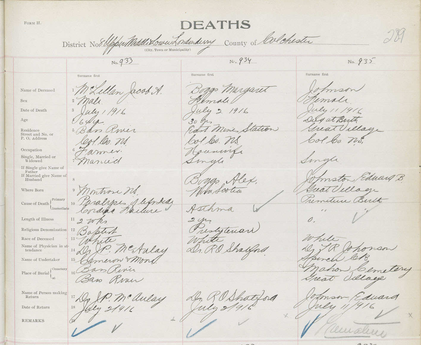 Female Death Registration: Year: 1916 book: 31 page: 289 number: 935