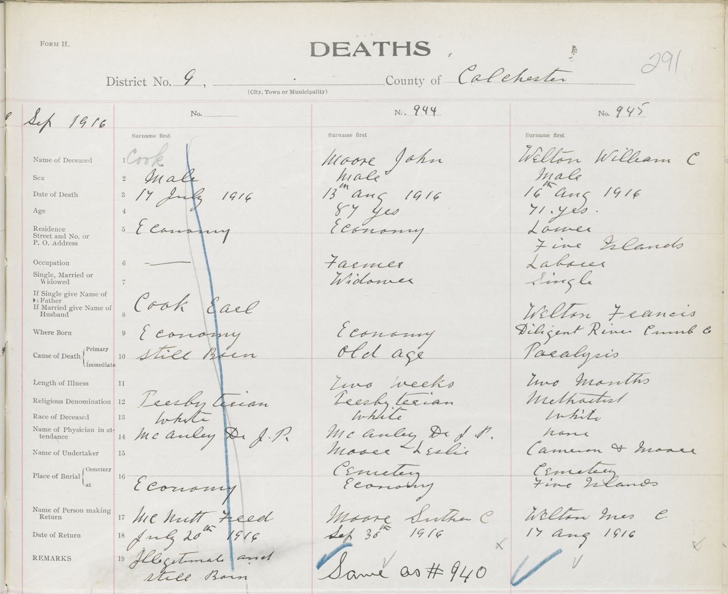 Male Death Registration: Year: 1916 book: 31 page: 291 number: 945