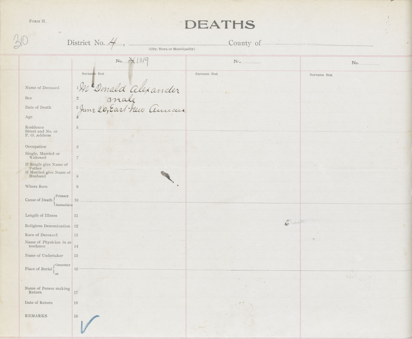 Death Registration: Year: 1916 book: 31 page: 310 number: 1019