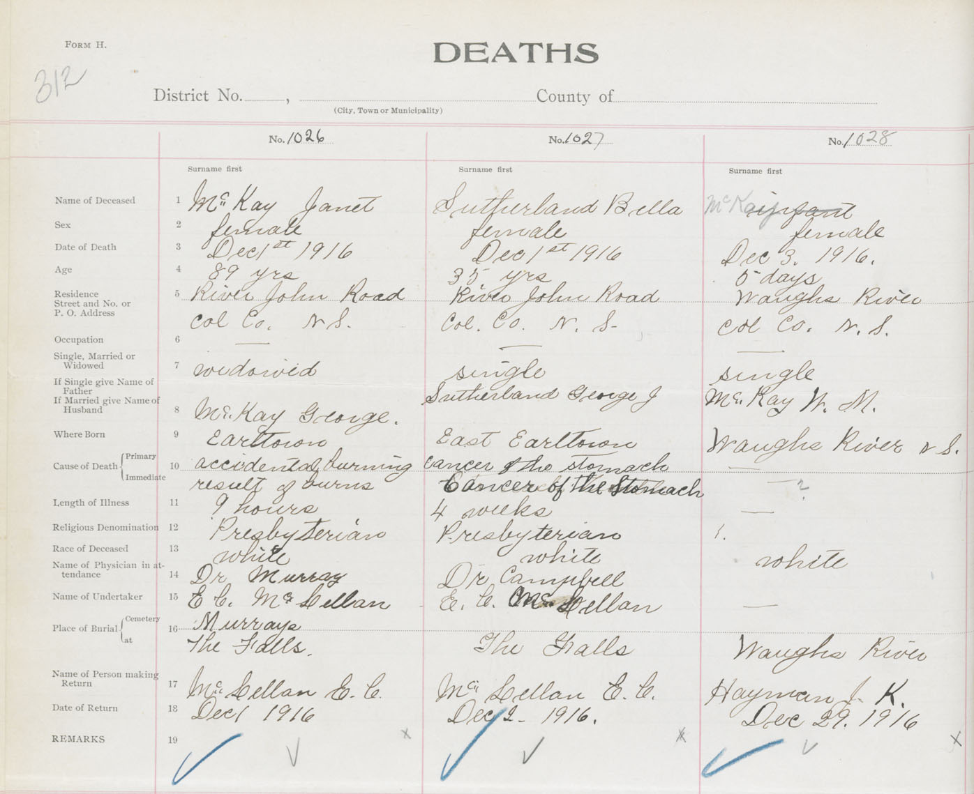 Female Death Registration: Year: 1916 book: 31 page: 312 number: 1028