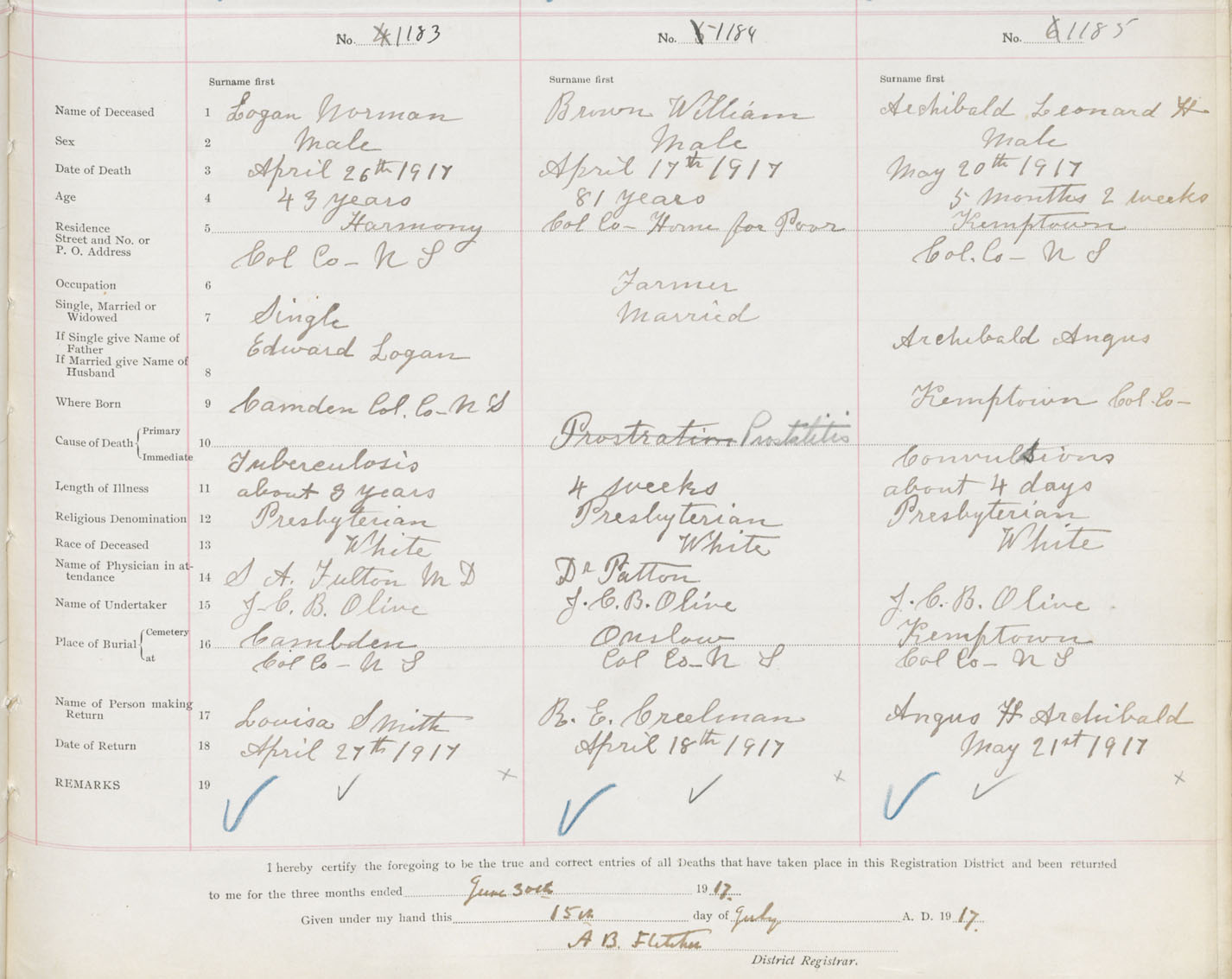 Male Death Registration: Year: 1917 book: 31 page: 351 number: 1185