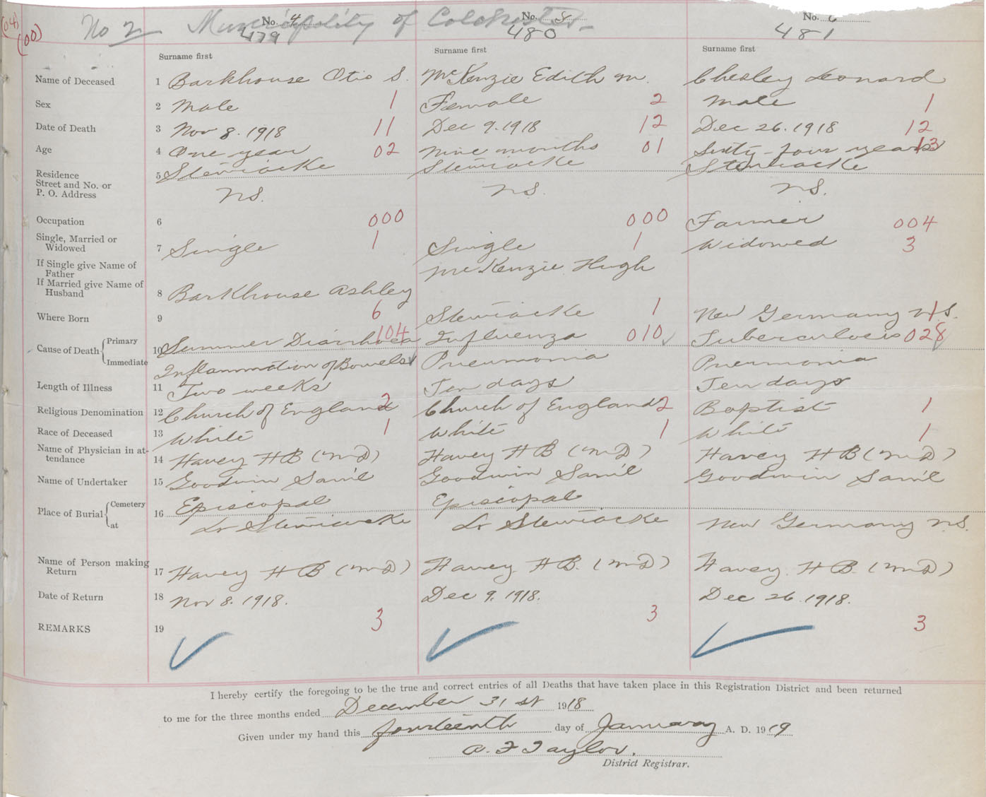 Male Death Registration: Year: 1918 book: 32 page: 121 number: 479