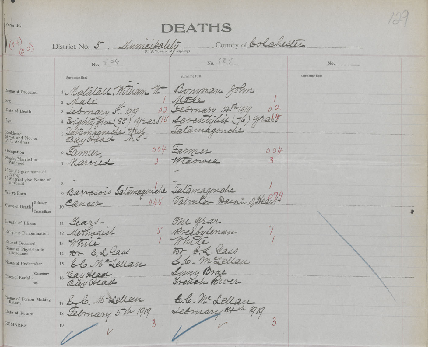 Male Death Registration: Year: 1919 book: 32 page: 129 number: 504