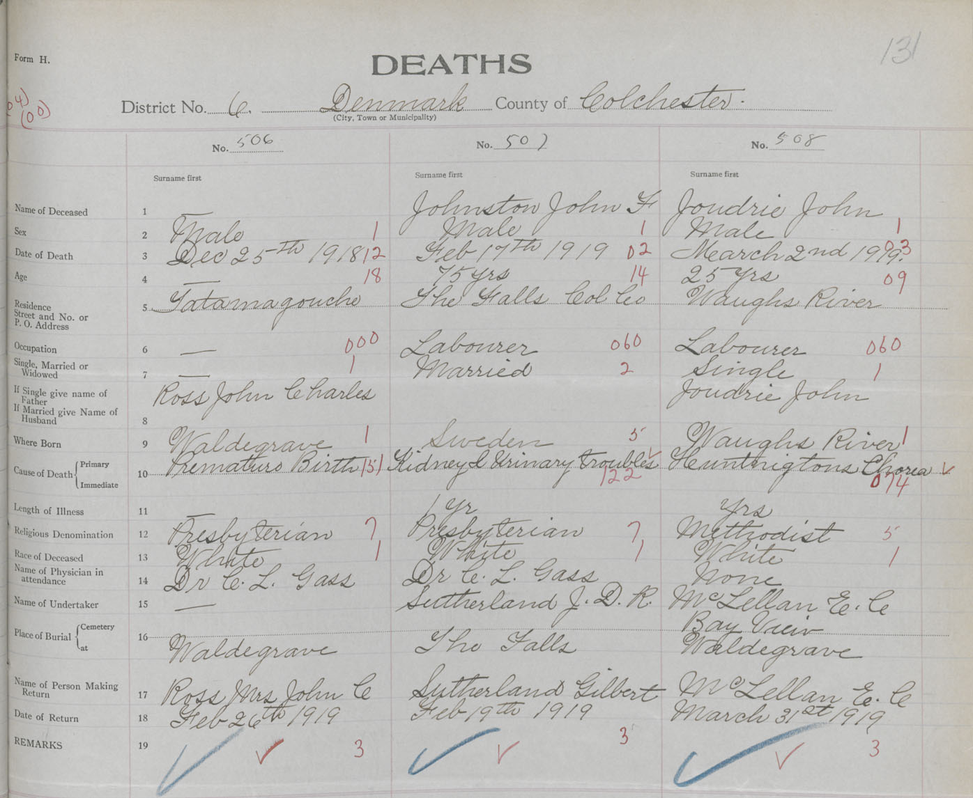 Male Death Registration: Year: 1919 book: 32 page: 131 number: 506