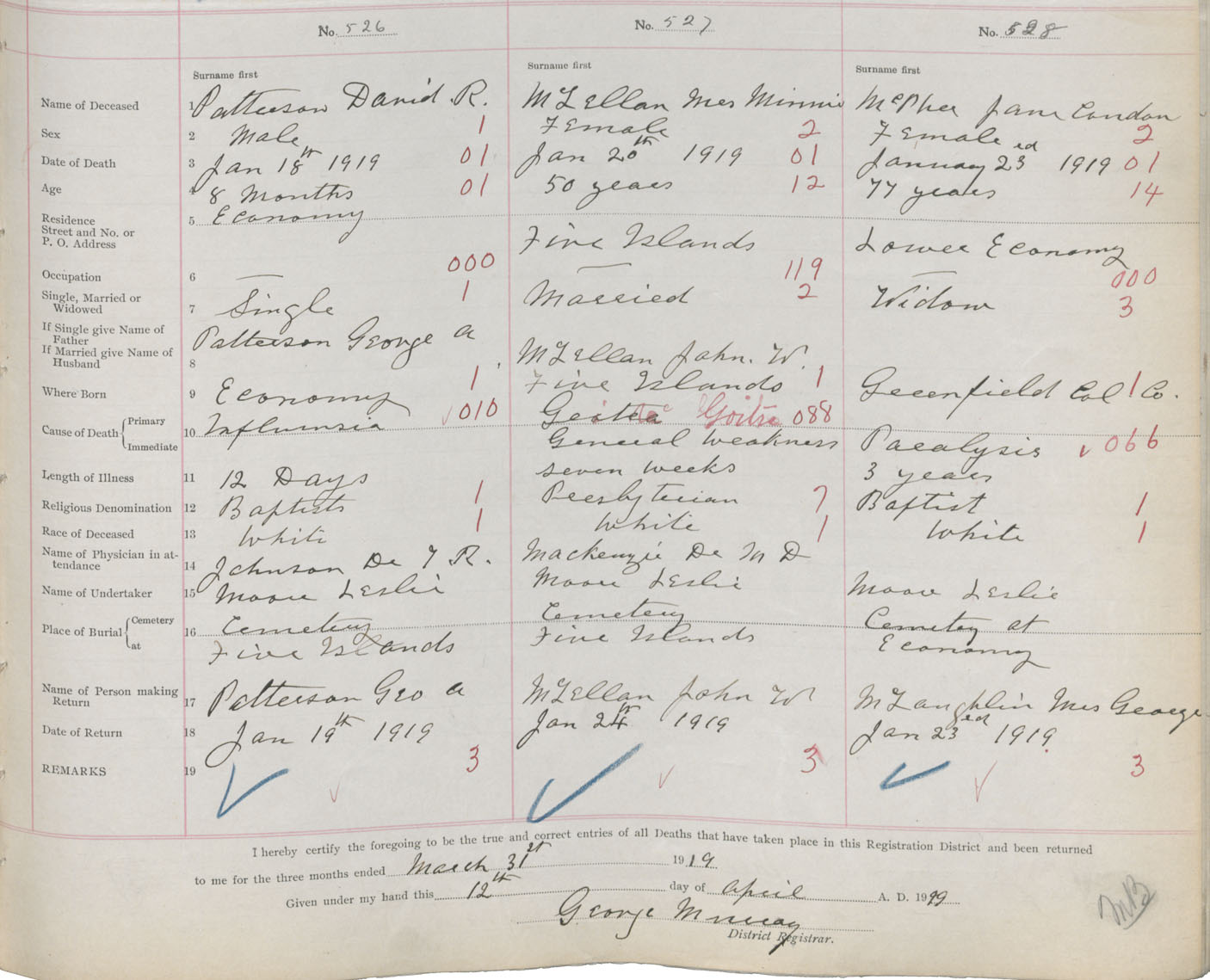 Male Death Registration: Year: 1919 book: 32 page: 137 number: 526