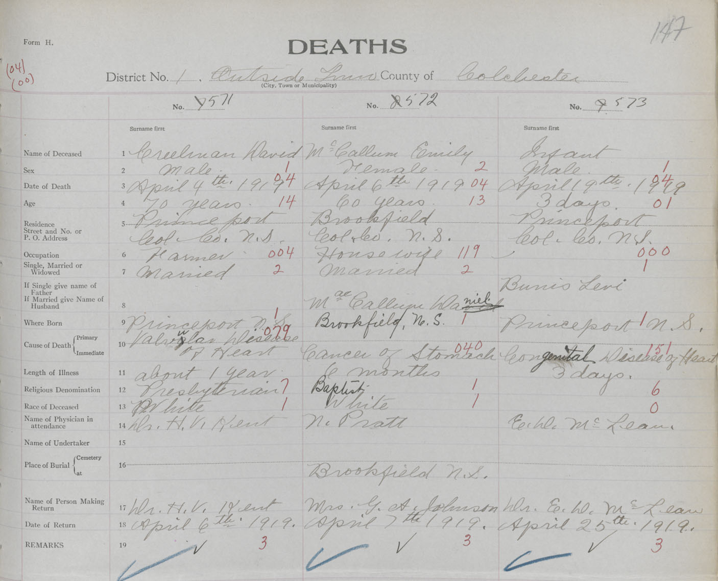 Male Death Registration: Year: 1919 book: 32 page: 147 number: 573