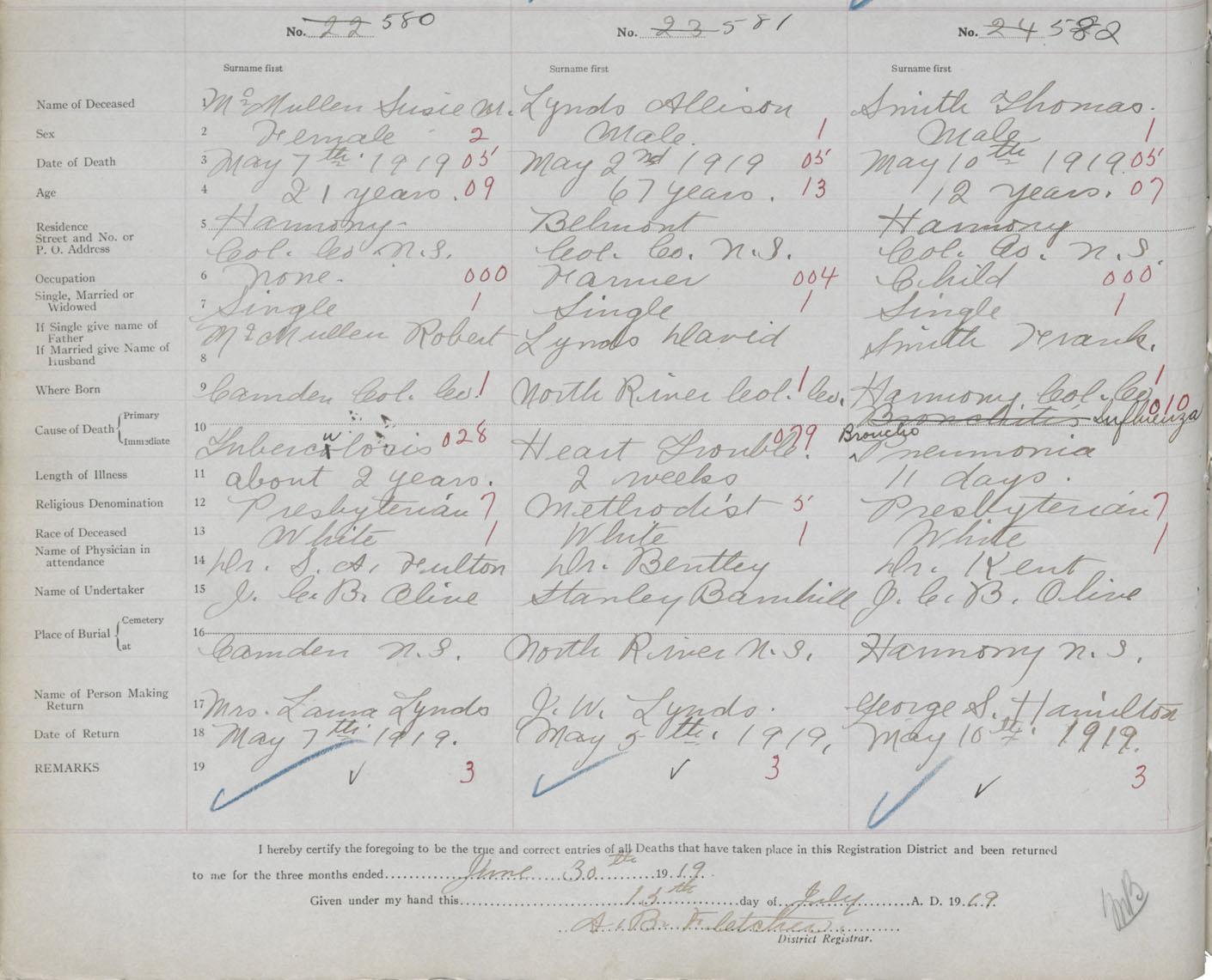 Male Death Registration: Year: 1919 book: 32 page: 148 number: 582