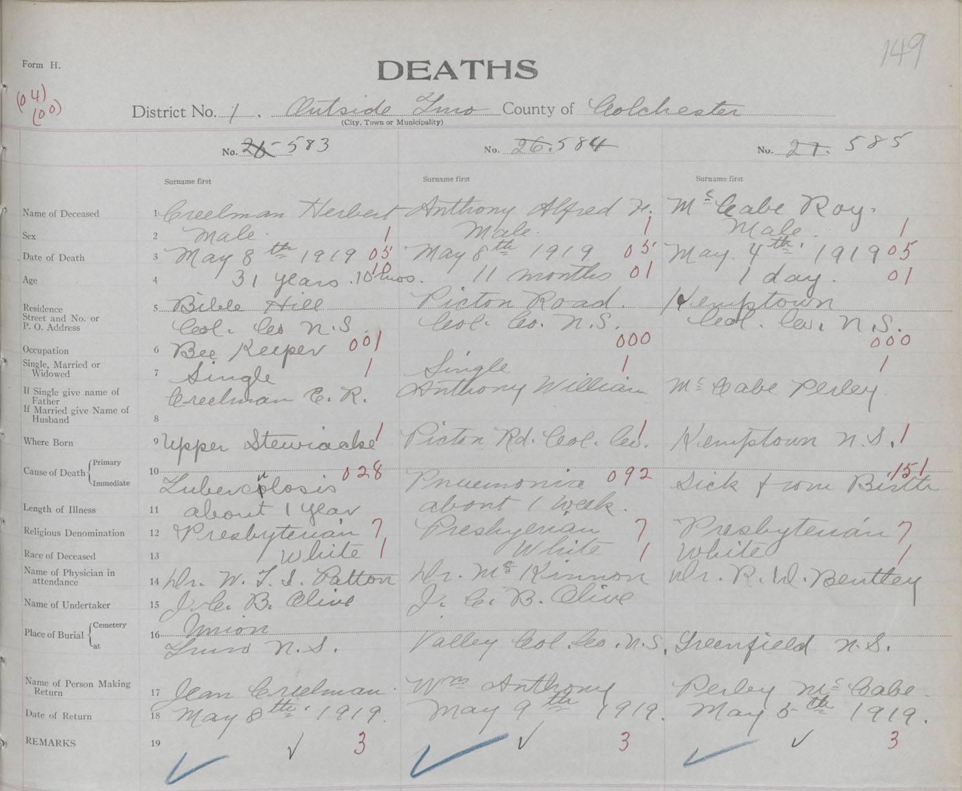 Male Death Registration: Year: 1919 book: 32 page: 149 number: 585