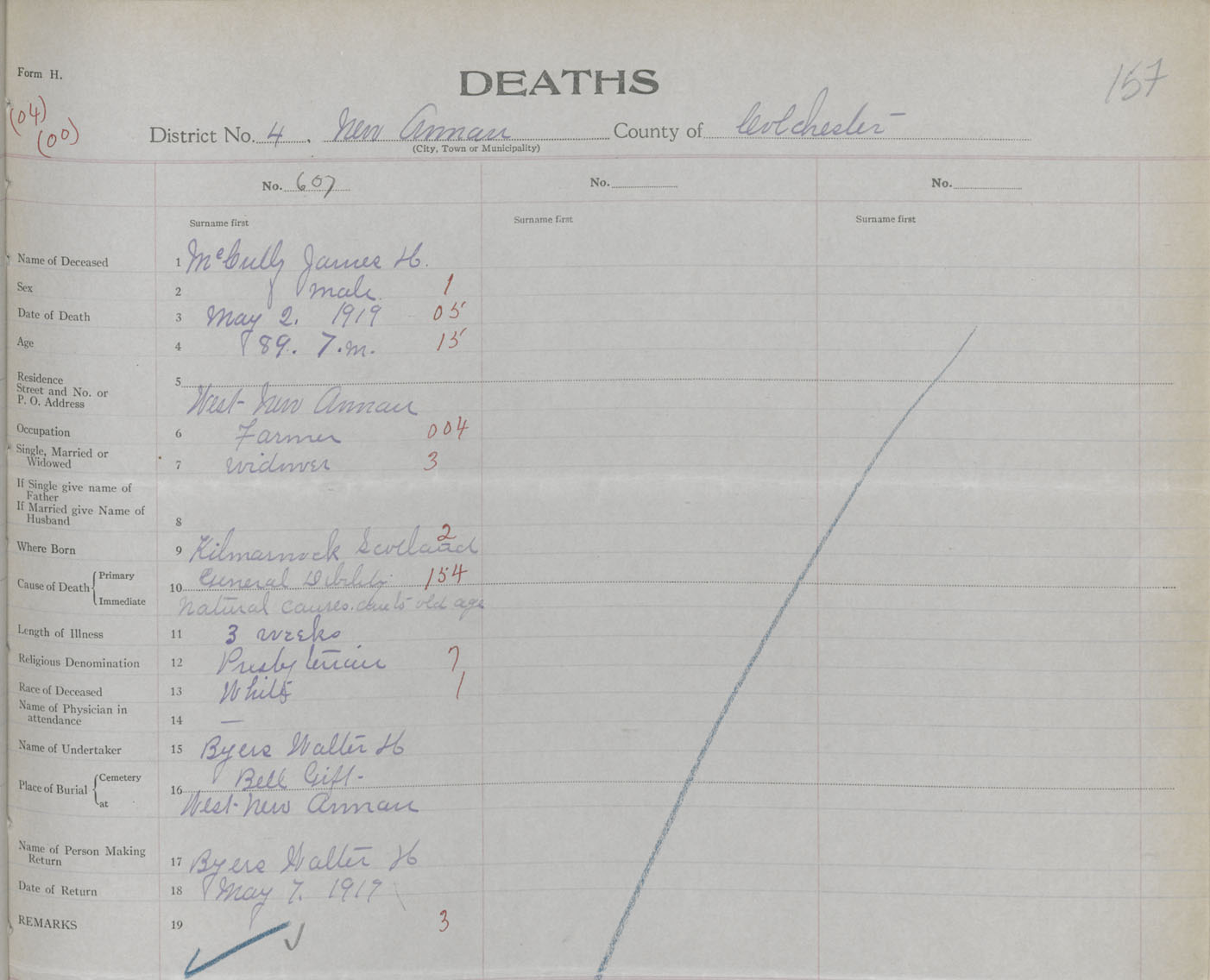 Male Death Registration: Year: 1919 book: 32 page: 157 number: 607