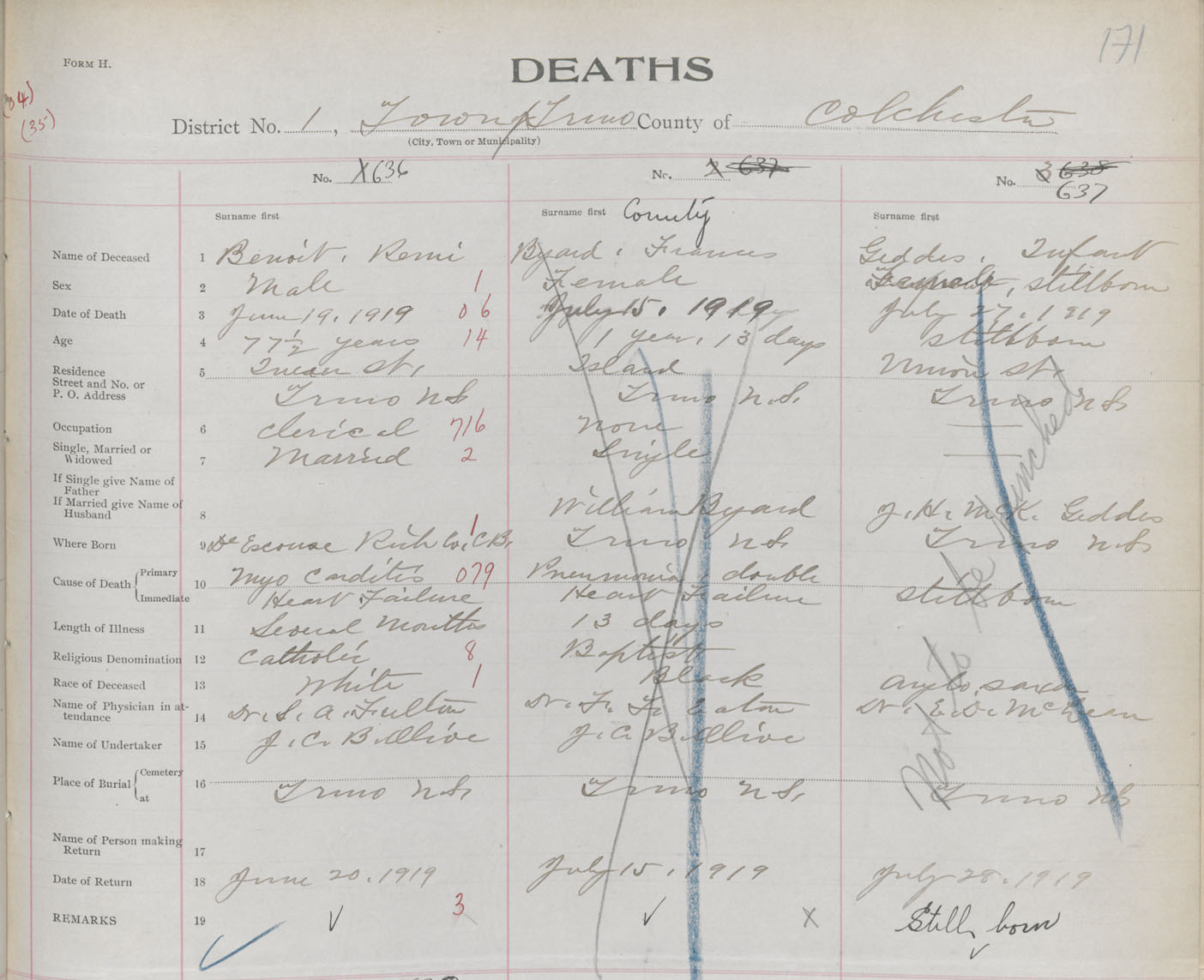 Female Death Registration: Year: 1919 book: 32 page: 171 number: 637