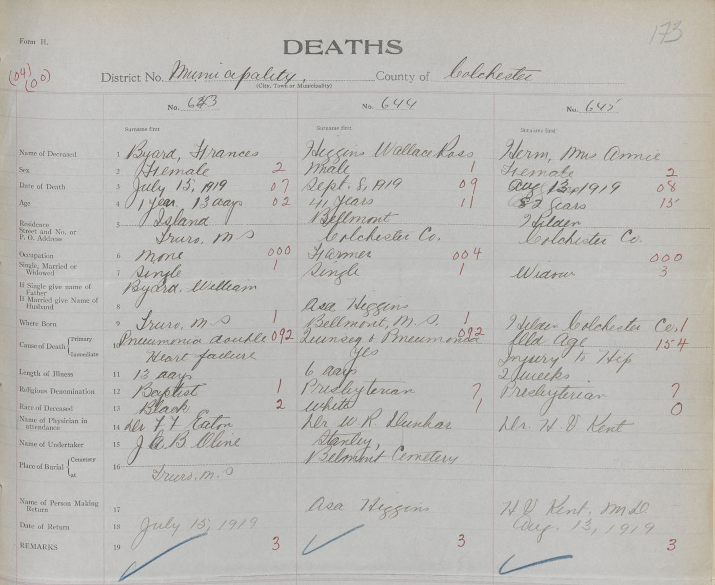 Female Death Registration: Year: 1919 book: 32 page: 173 number: 645