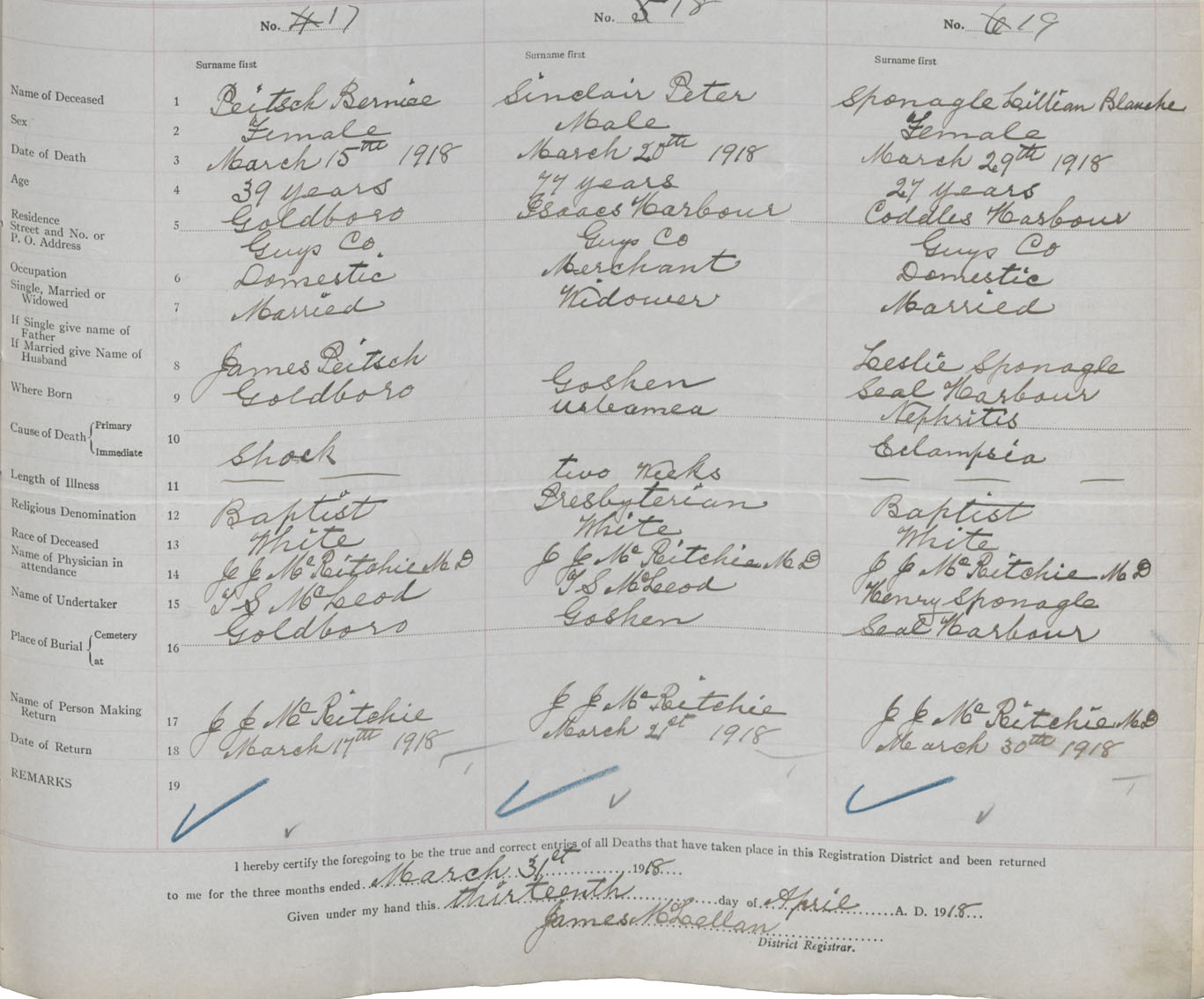 Female Death Registration: Year: 1918 book: 32 page: 199 number: 19
