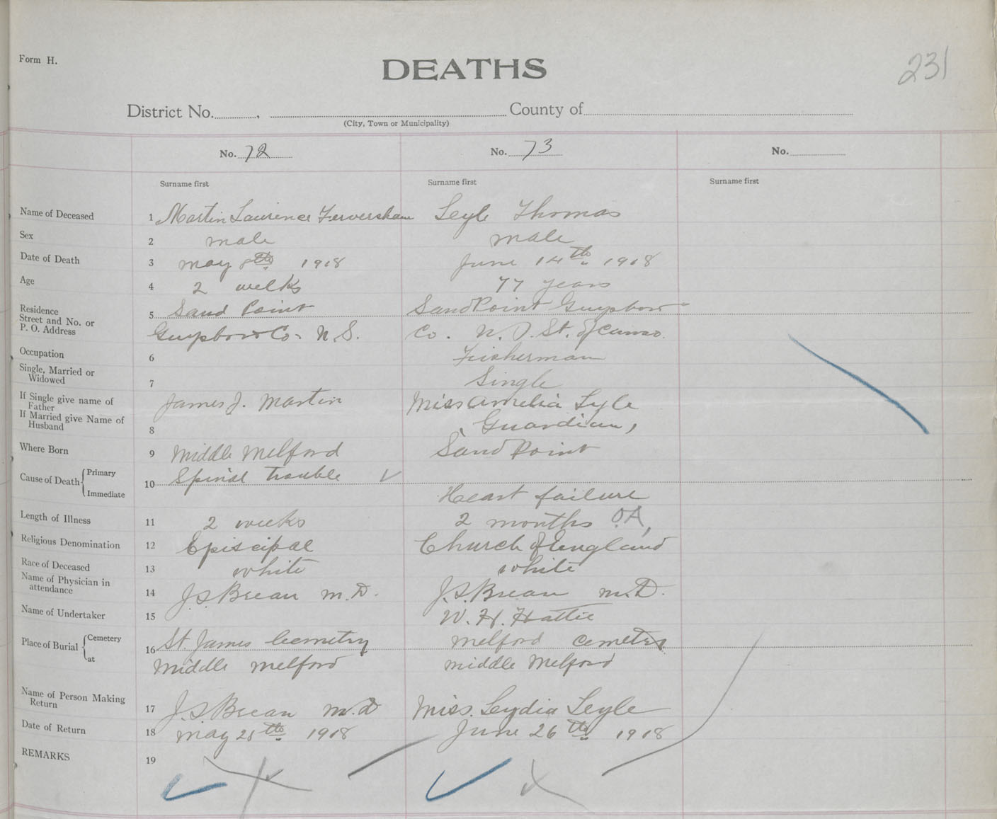 Male Death Registration: Year: 1918 book: 32 page: 231 number: 73