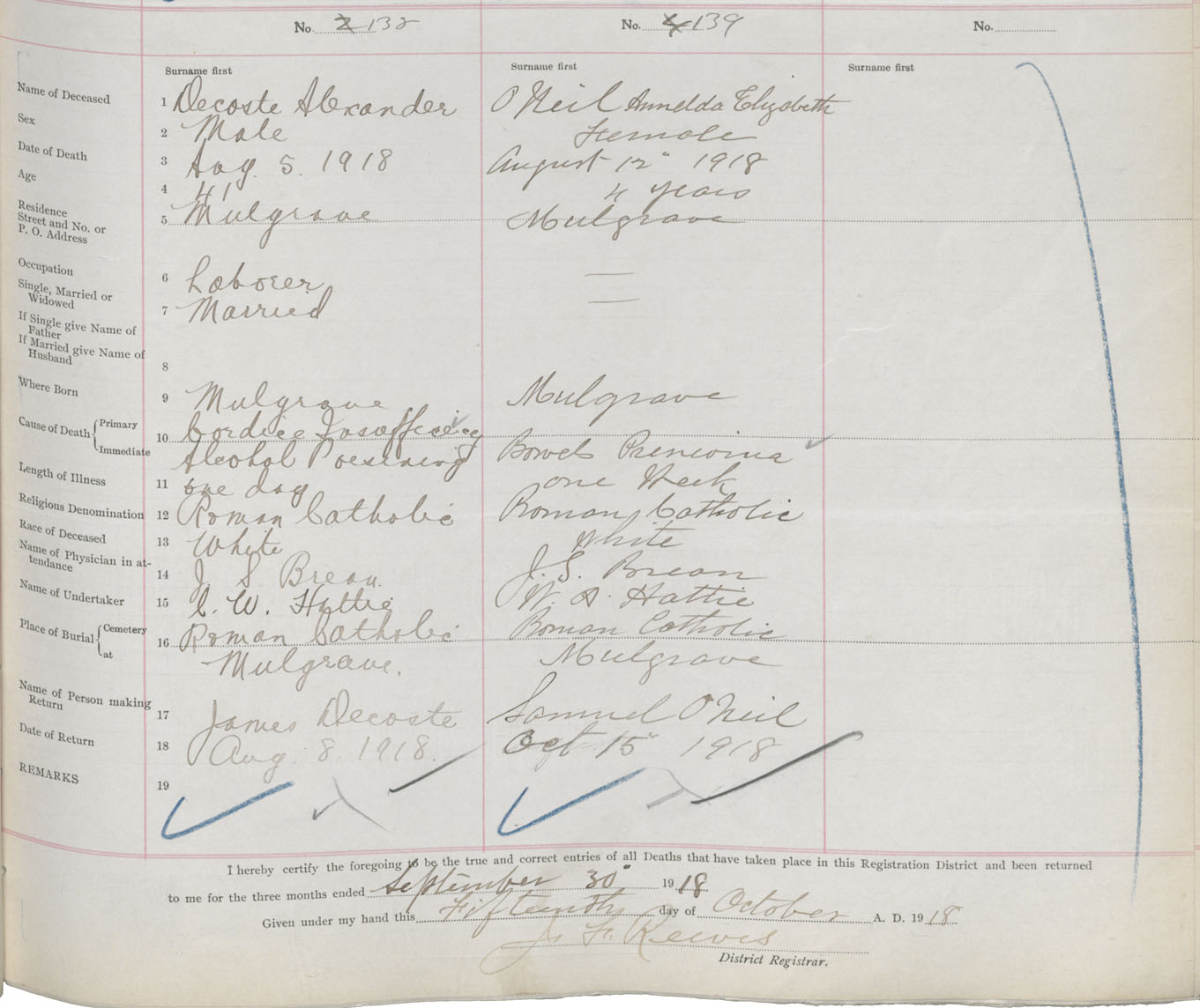 Male Death Registration: Year: 1918 book: 32 page: 267 number: 138