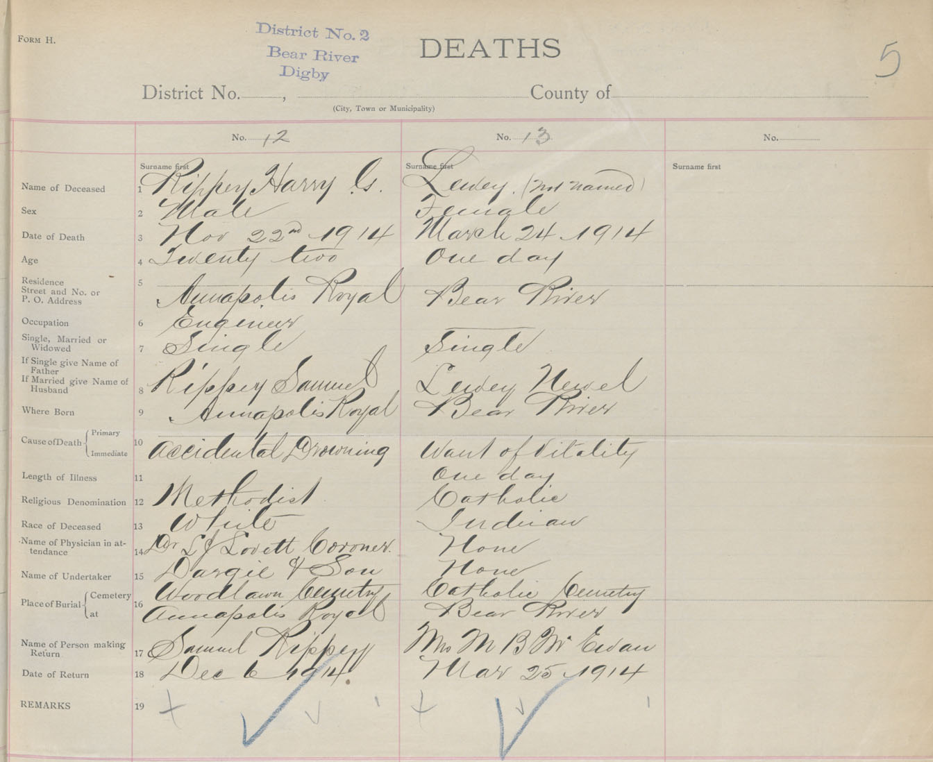 Male Death Registration: Year: 1914 book: 33 page: 5 number: 12