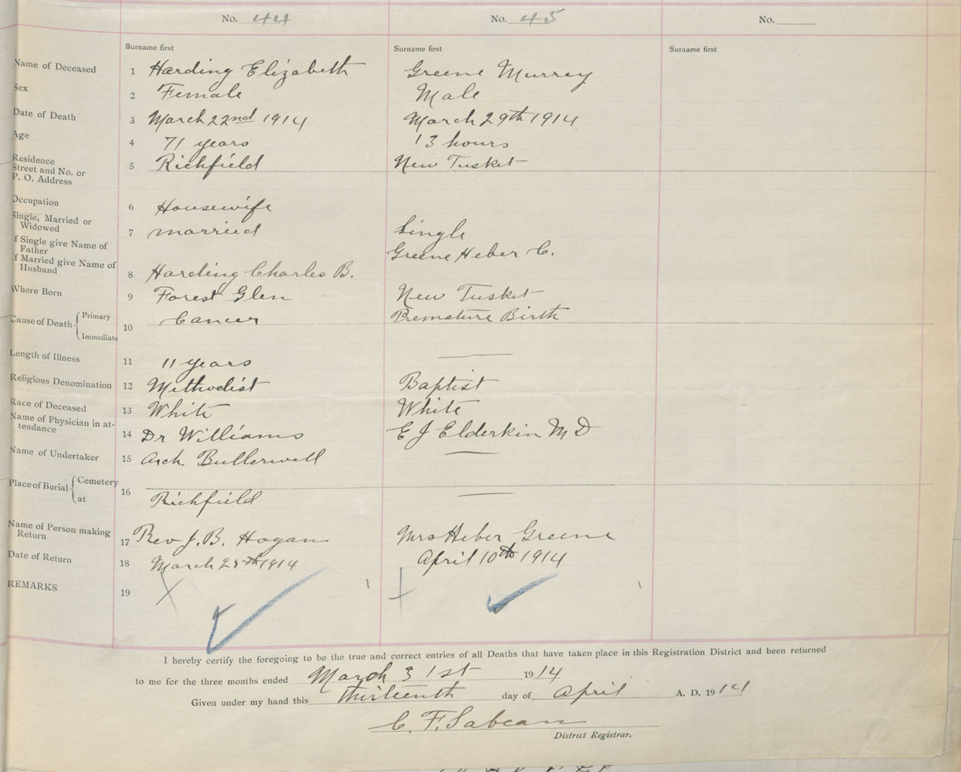 Female Death Registration: Year: 1914 book: 33 page: 21 number: 44