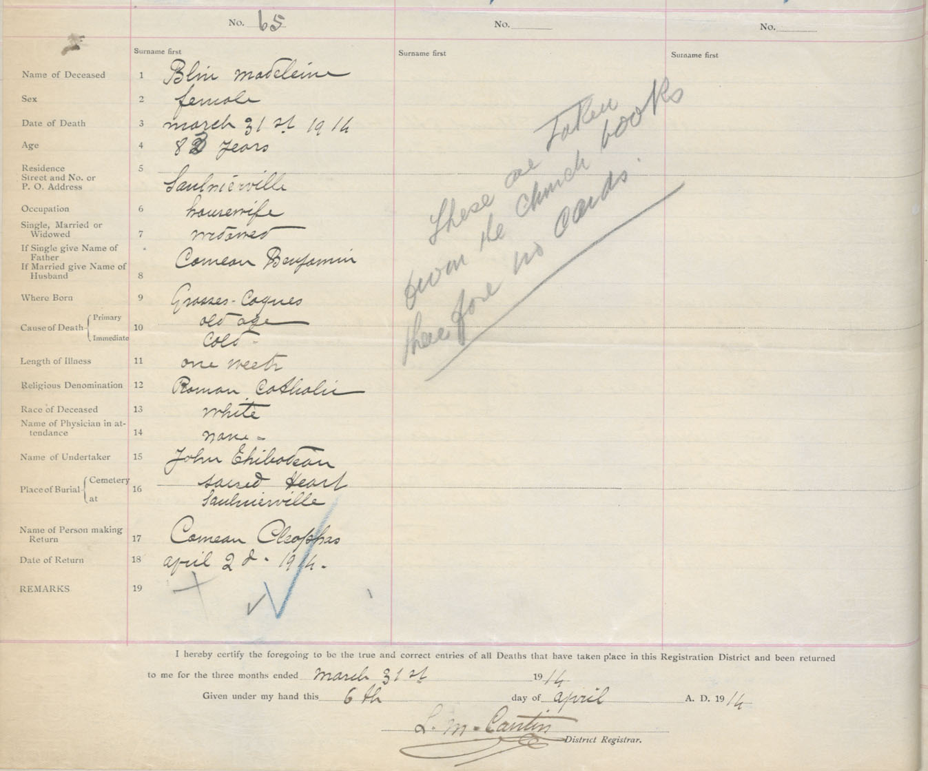 Female Death Registration: Year: 1914 book: 33 page: 28 number: 65