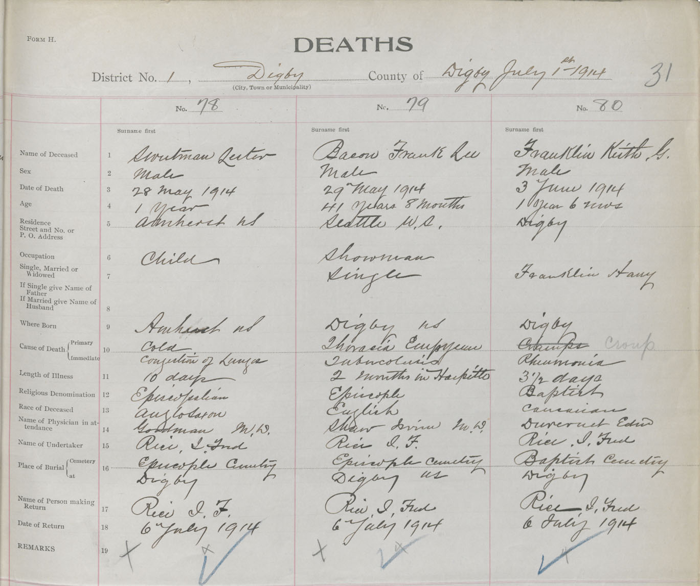 Male Death Registration: Year: 1914 book: 33 page: 31 number: 78