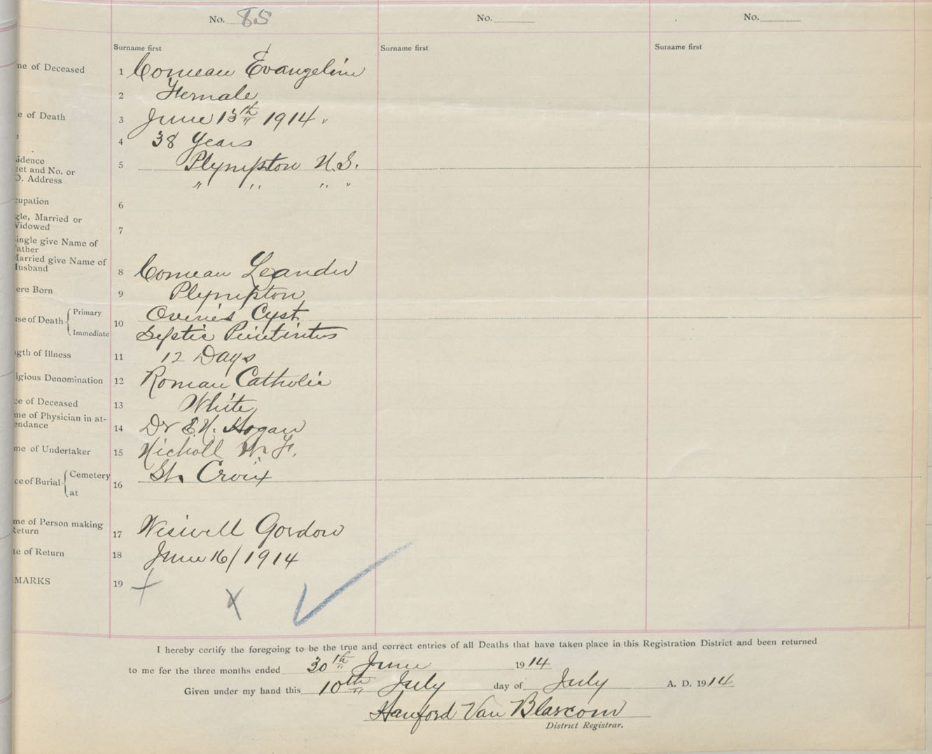Female Death Registration: Year: 1914 book: 33 page: 35 number: 85