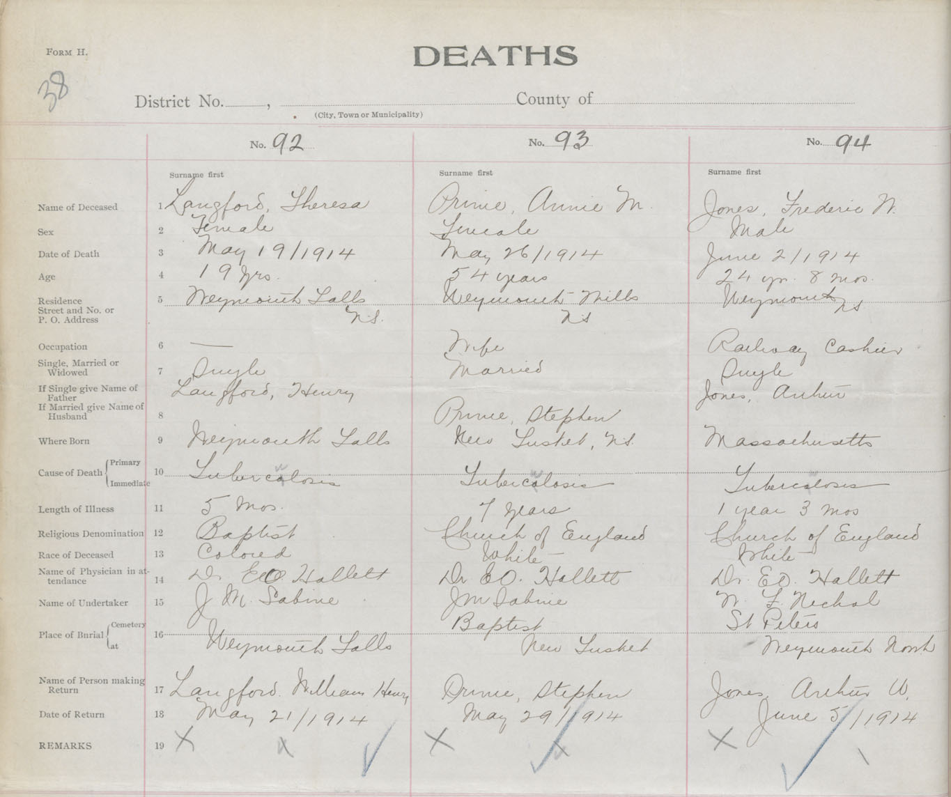 Female Death Registration: Year: 1914 book: 33 page: 38 number: 92