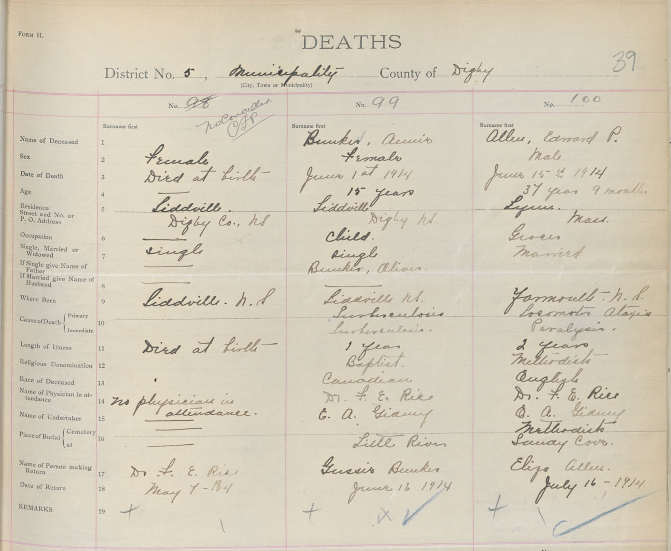Female Death Registration: Year: 1914 book: 33 page: 39 number: 99