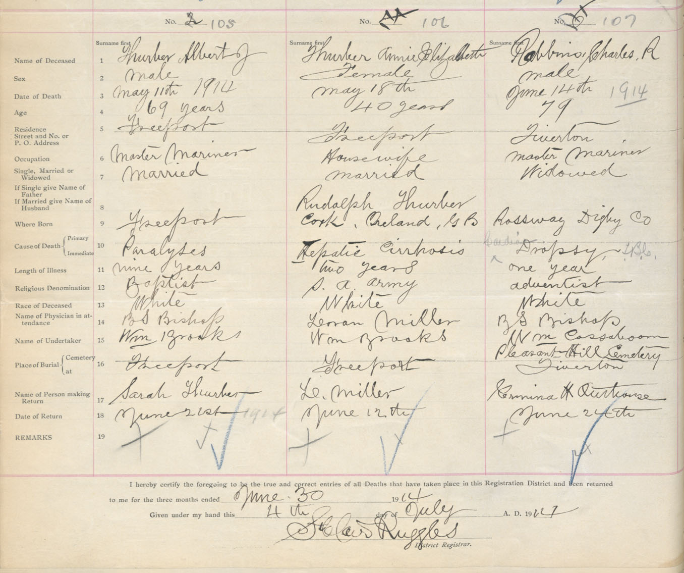 Male Death Registration: Year: 1914 book: 33 page: 42 number: 105