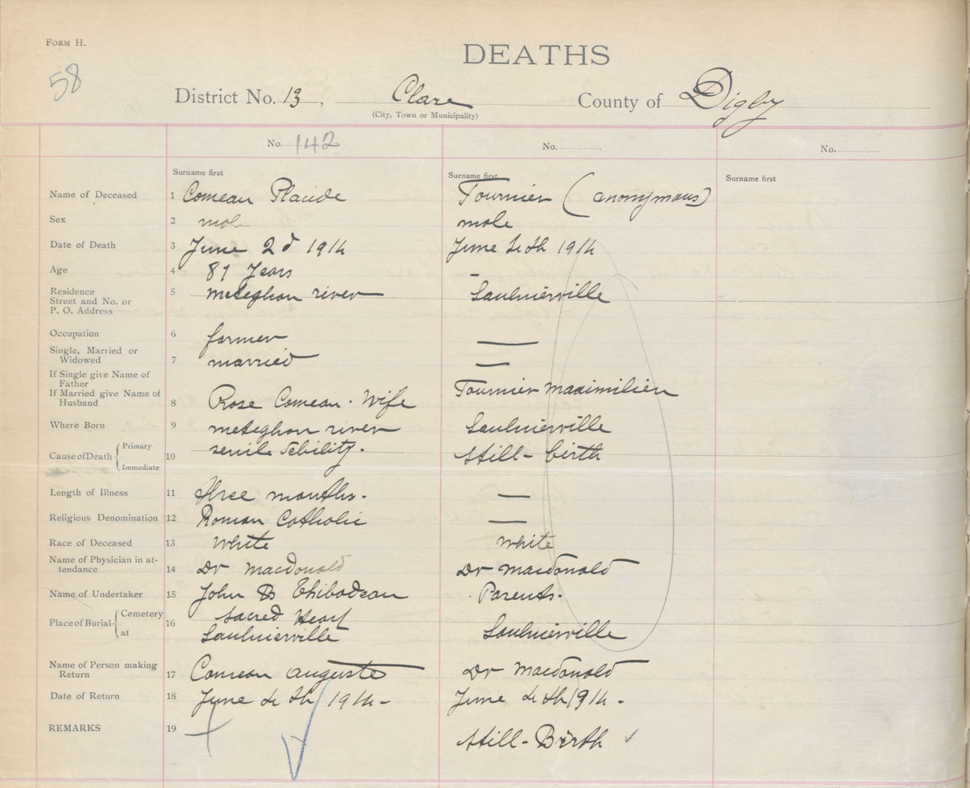 Male Death Registration: Year: 1914 book: 33 page: 58 number: 142