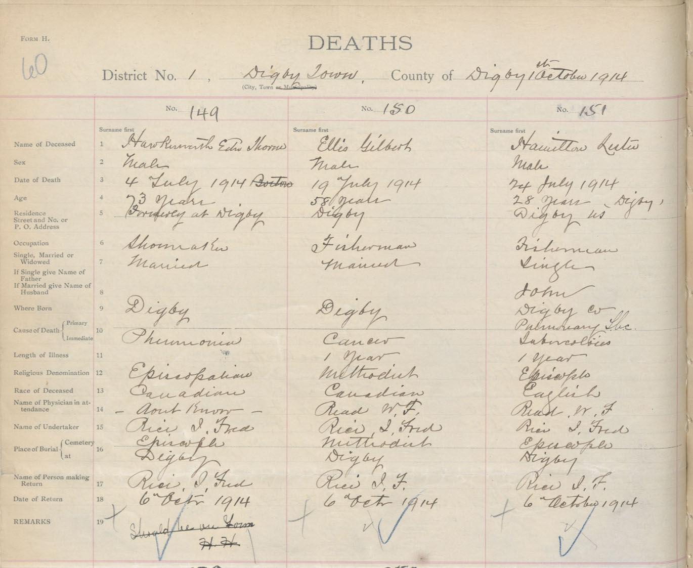 Male Death Registration: Year: 1914 book: 33 page: 60 number: 149