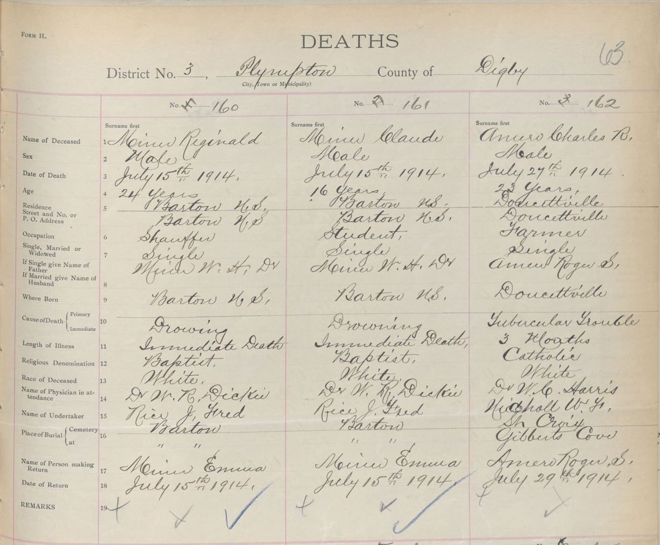 Male Death Registration: Year: 1914 book: 33 page: 63 number: 160