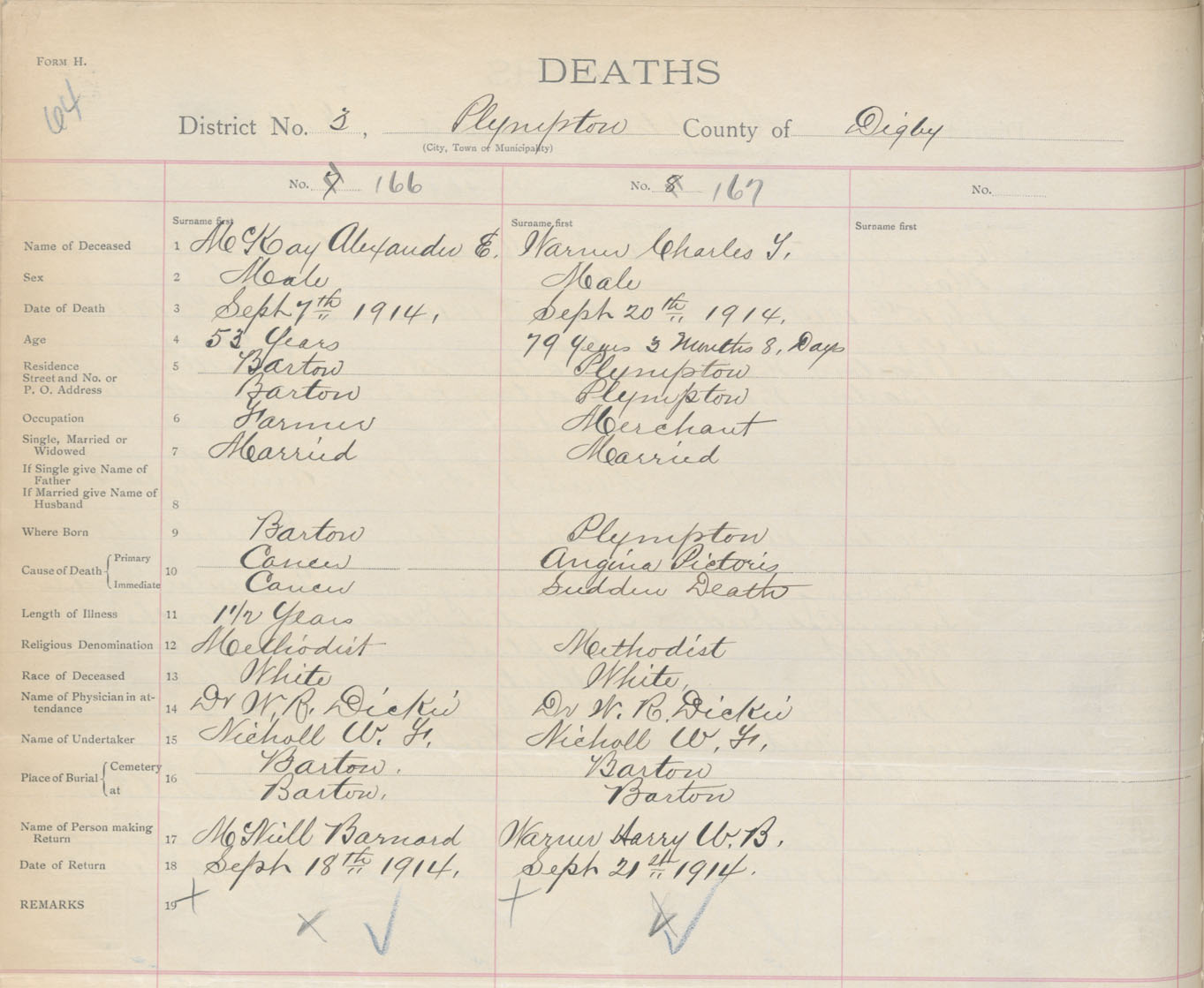 Male Death Registration: Year: 1914 book: 33 page: 64 number: 166